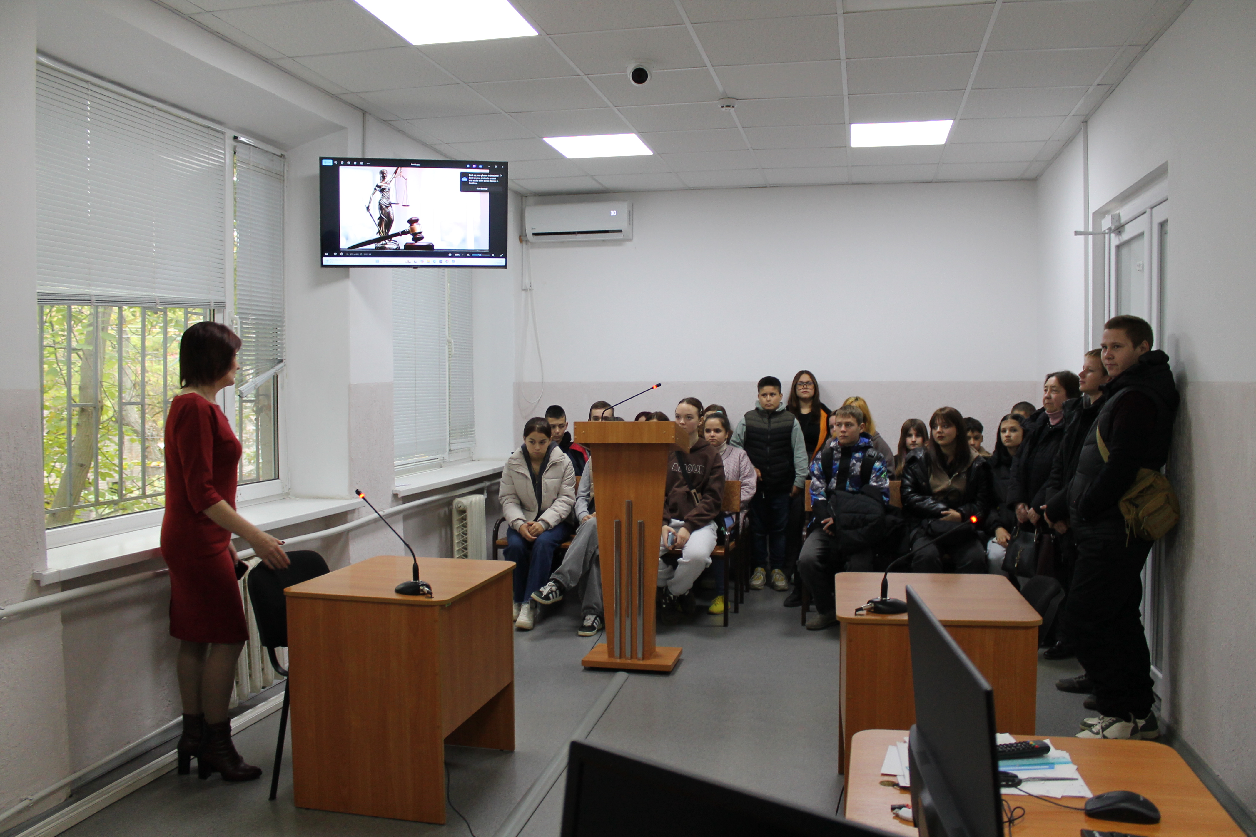 Гостей зустріла суддя-спікер Наталія Щербина, яка розповіла про свою професійну діяльність, виклики та відповідальність, що супроводжують роботу судді, надала поради тим, хто планує обрати професію судді.